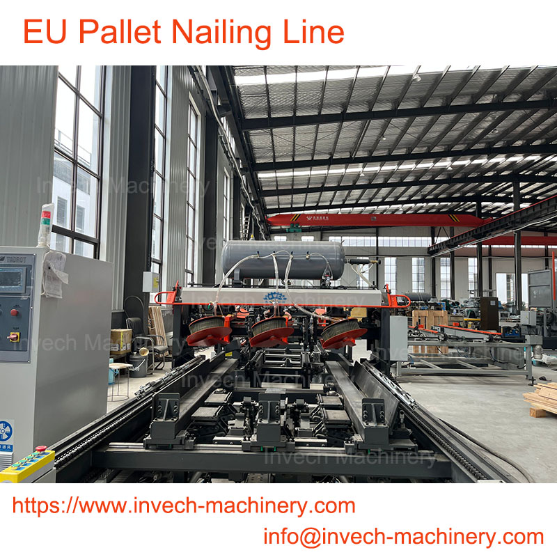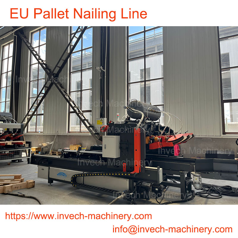 EU Wood Pallet Assembly Line Wood Pallet Machine is inlcuding wood pallet block assembly machine,wood pallet naling machine,branding machine,conner cutting machine,flapping machine and stacking.